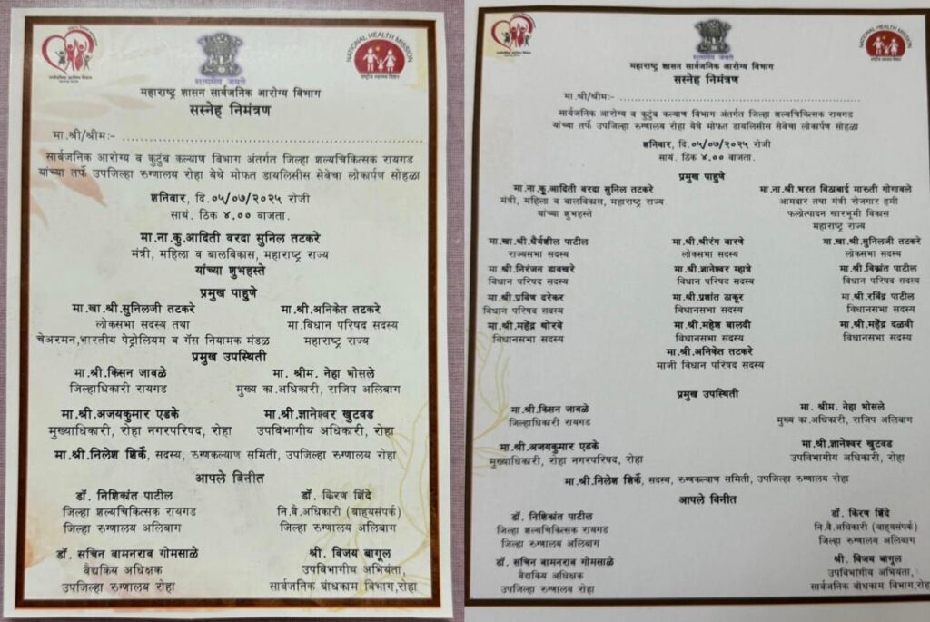 मात्र, या कार्यक्रमाच्या निमंत्रण पत्रिकेमध्ये आरोग्यमंत्री मा. ना. प्रकाशराव आबिटकर (शिवसेना), आरोग्य राज्यमंत्री मा. ना. मेघनाताई बोर्डीकर (भाजपा), मा. राज्यसभा खासदार धैर्यशील दादा पाटील, पेण-रोहा-सुधागडचे आमदार मा. रवीशेठ पाटील, तसेच अलिबाग-मुरूड-रोहाचे आमदार मा. महेंद्रशेट दळवी यांची नावे जाणीवपूर्वक वगळण्यात आली आहेत, हे अत्यंत दुर्दैवी आणि खेदजनक आहे.